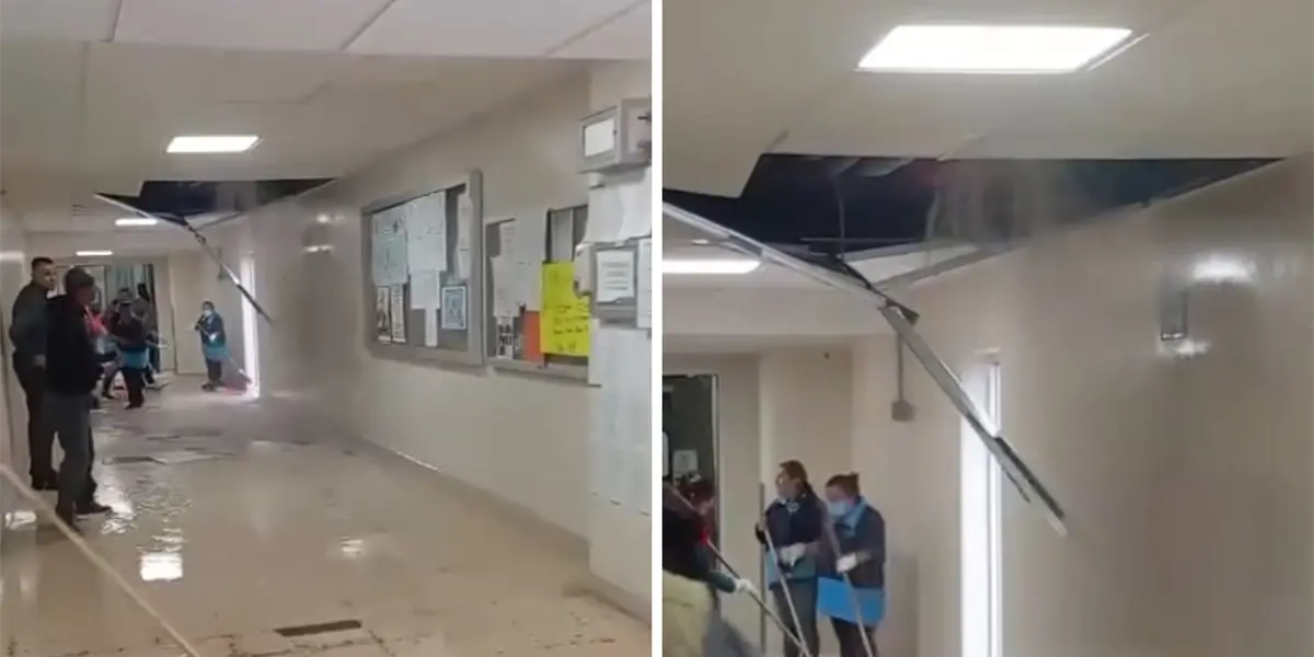 En el video, el techo del área afectada se observa prácticamente convertido en una cascada, mientras el agua cae de manera directa dentro de las instalaciones.