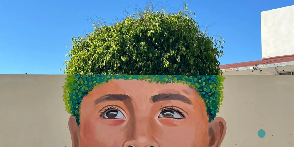 Este se encuentra específicamente en el Jardín de Niños Estado de BCS, en Guerrero Negro y la obra muestra el rostro de un niño mirando ligeramente hacia arriba, con tonos cálidos y detalles expresivos.