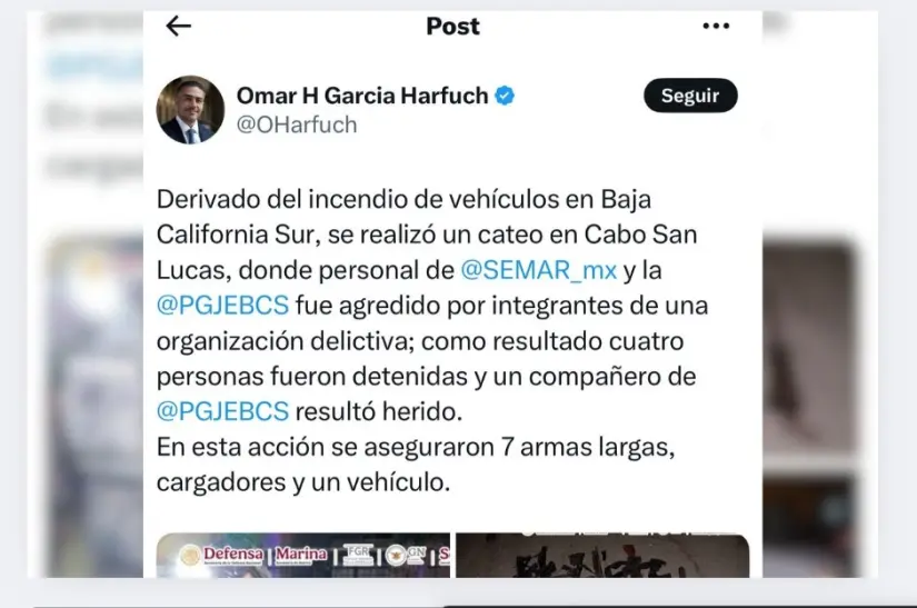 "Derivado del incendio de vehículos en Baja California Sur, se realizó un cateo en Cabo San Lucas, donde personal de SEMAR y la PGJE de Baja California fue agredido por integrantes de una organización delictiva; como resultado cuatro personas fueron detenidas y un compañero de la Procuraduría General de Justicia de Baja California resultó herido”.
