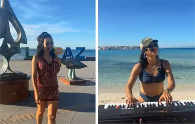 En uno de los videos que compartió en redes, aparece frente a las letras del malecón, con su teclado y el mar de fondo, interpretando “La reina de ajedrez”, parte de su nuevo disco “Magia” (2025).