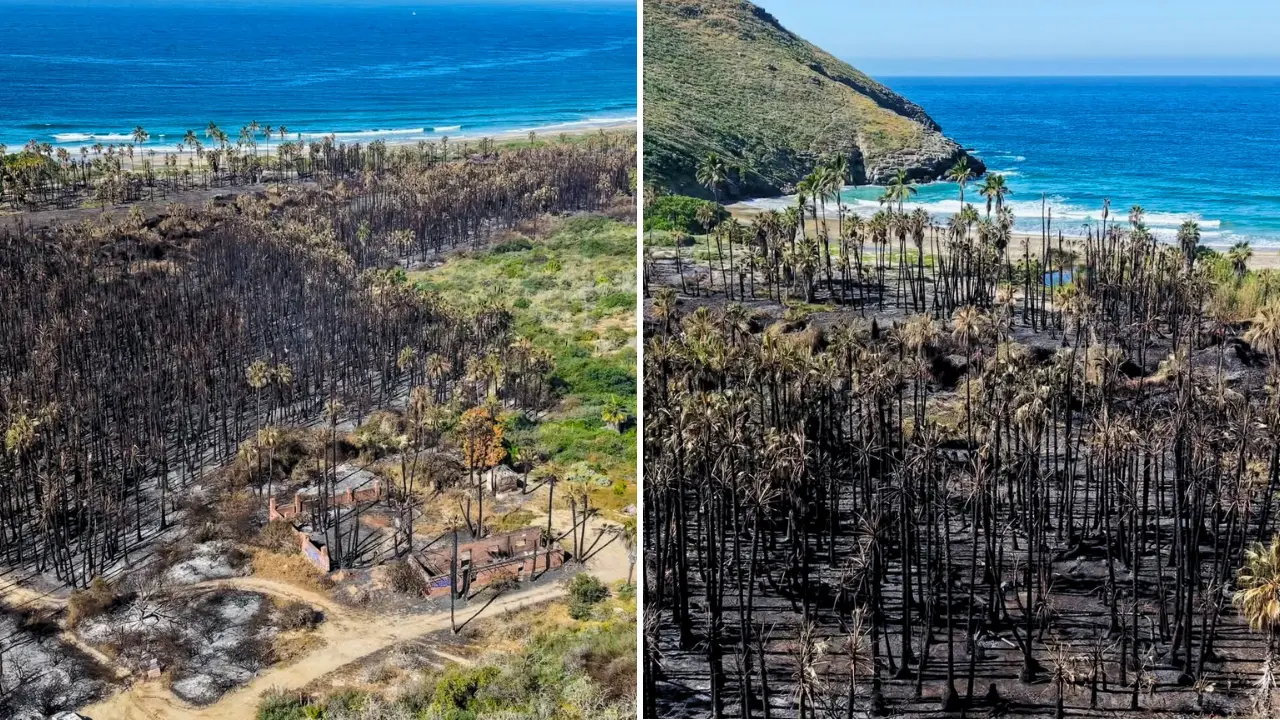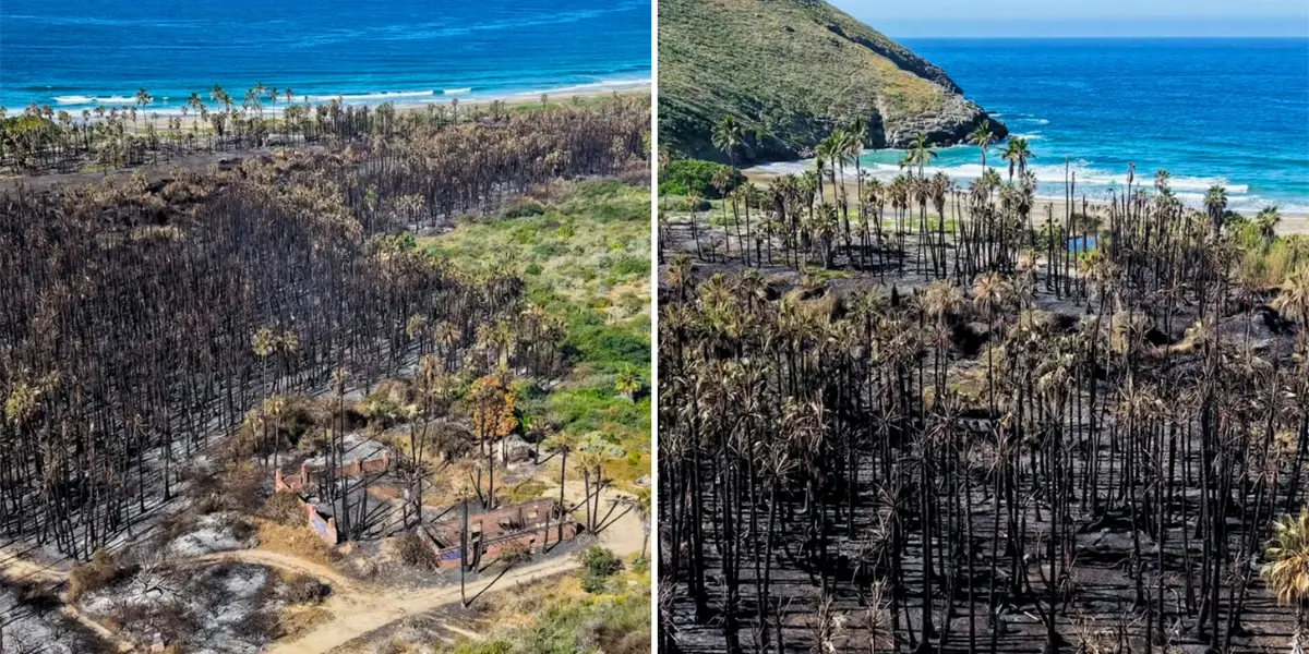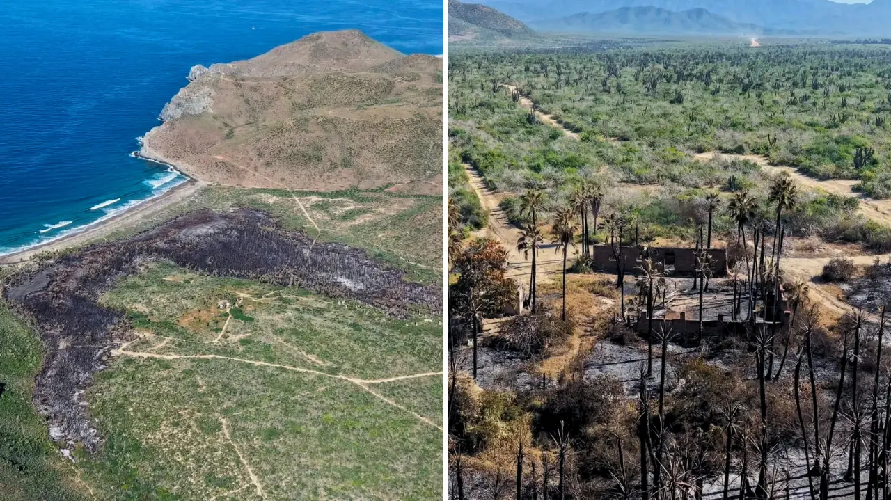 Las imágenes aéreas muestran la magnitud del daño, un paisaje ennegrecido, palmas calcinadas y estructuras reducidas a cenizas en una de las zonas naturales más emblemáticas del Pacífico Sudcaliforniano.