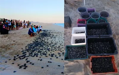 En solo dos días, el corral de incubación de San José del Cabo registró la eclosión de 60 nidos y el nacimiento de unas 4,500 tortuguitas Golfina (Lepidochelys olivacea), que fueron liberadas al mar para iniciar su vida en el océano.