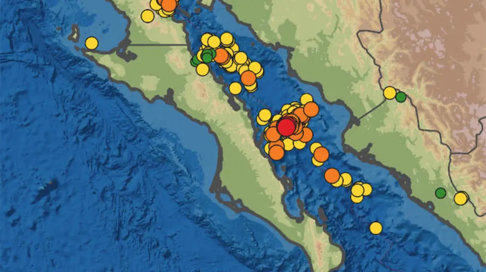 En abril 2024, el SSN reportó 2,252 temblores en México. El mayor, de 5.6, ocurrió el 18 de abril a las 9:12 h en el Mar de Cortés, a 70 km al este de Loreto, BCS.