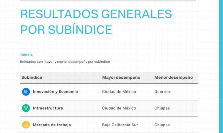 Este índice evalúa, a través de 53 variables agrupadas en seis subíndices, las 32 entidades federativas del país, es las que la capital ocupa el primer lugar. Como en todos los índices que el IMCO genera, la información proviene de fuentes públicas y oficiales.