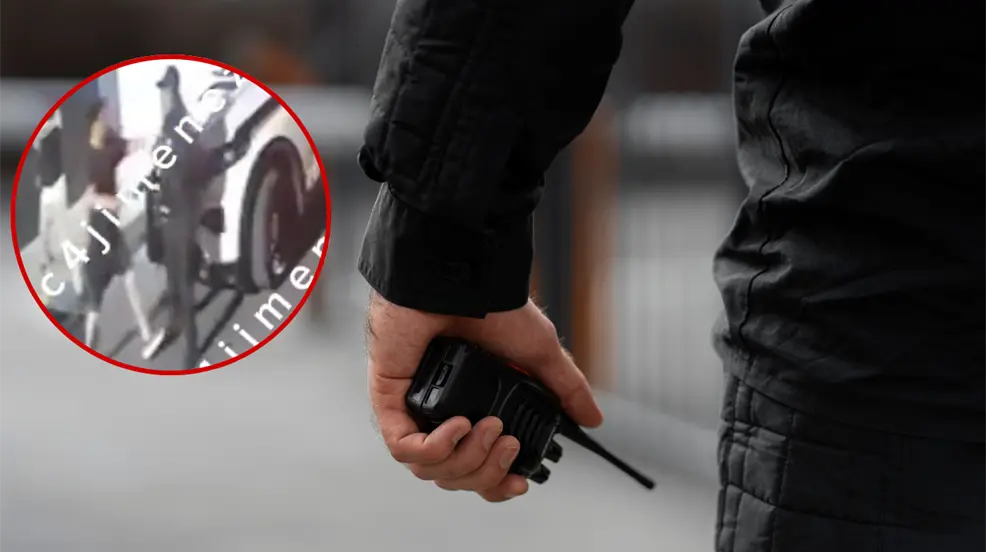 El oficial observa a dos hombres discutir, un hombre con sudadera blanca y negra sostiene una escoba, y es visible que el hombre que está dentro, busca darle un golpe en el rostro; sin embargo, este se aleja unos pasos.