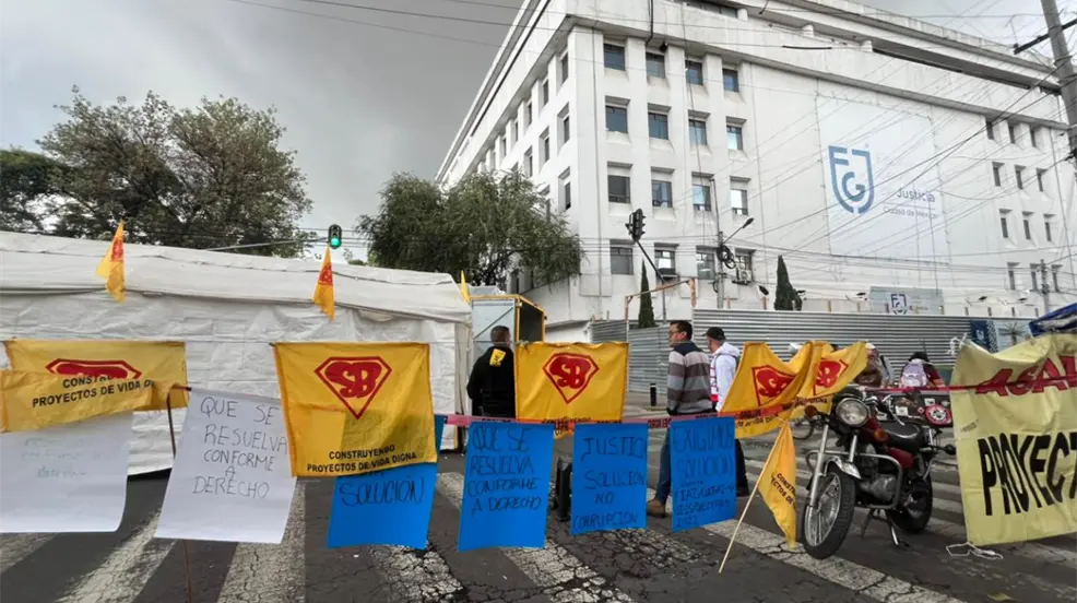 Integrantes de la Asamblea de Barrios CDMX instalaron un plantón en Río de la Loza, frente a las instalaciones de la Fiscalía General de Justicia de la Ciudad de México (FGJCDMX), para exigir una resolución en torno a un predio en disputa ubicado en la alcaldía Azcapotzalco.