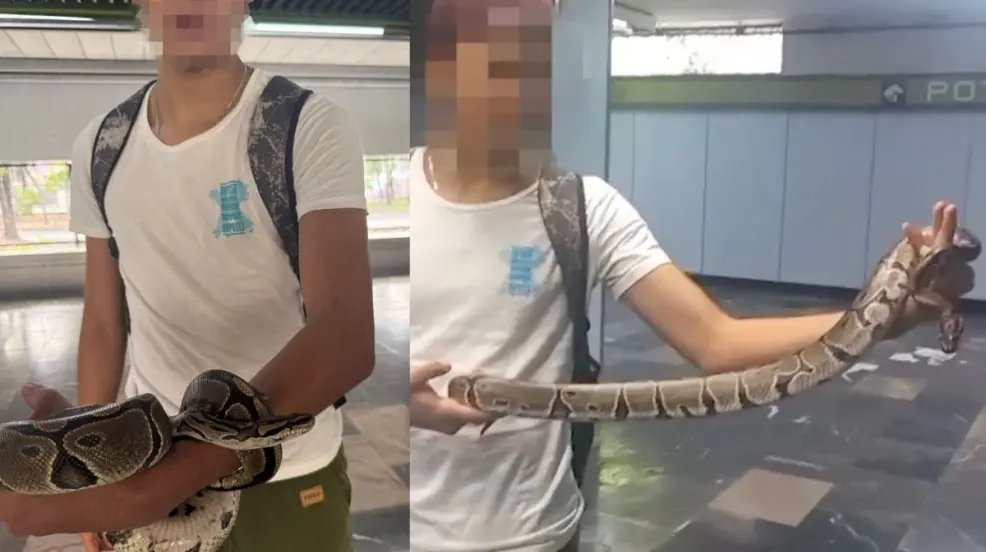 Menor de edad pasea pitón en el Metro de CDMX; lo detienen por no portar correctamente al reptil