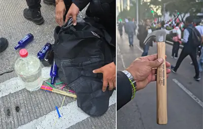 La SSC CDMX precisó que, durante el acompañamiento de la marcha, los elementos policiales también aseguraron una barra de metal y una mochila con pintura en aerosol, las cuales estaban en posesión de un grupo de encapuchados que avanzaban entre los contingentes.