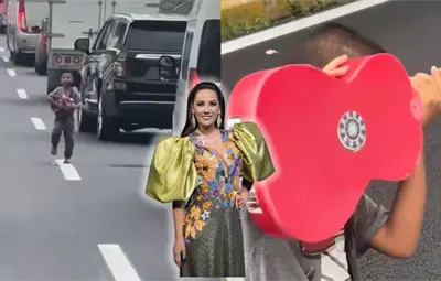 Cuando el vehículo donde viajaba la actriz se acercó al niño comenzó a preguntarle donde se encontraba su mamá, a lo que el menor, al notar que lo estaban grabando procedió a cubrirse en rostro con la guitarra, sin responder a la pregunta.