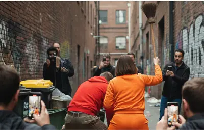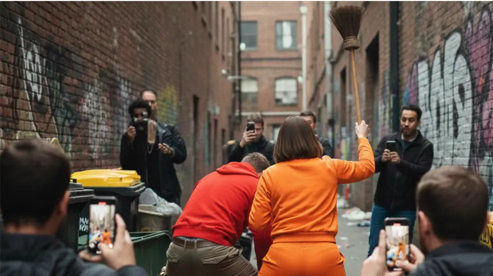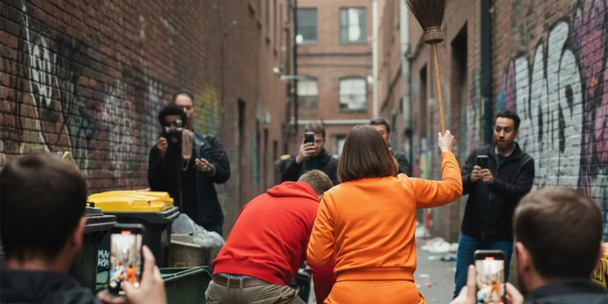 Es en ese momento cuando una mujer vestida con un conjunto deportivo naranja aparece en escena e intenta separarlos empujándolos; al no conseguirlo, lo intenta con una escoba y comienza a golpear suavemente a ambos con la intención de detener la pelea.