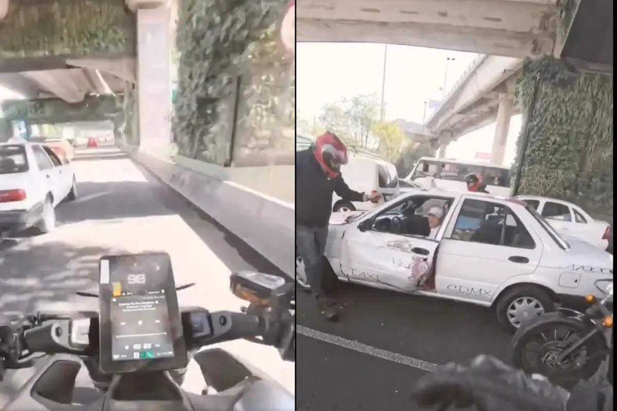 Un acto de absoluta imprudencia y falta de civilidad vial por parte de un conductor de taxi terminó en un accidente que involucró a un tercer motociclista en una concurrida vialidad de la Ciudad de México.