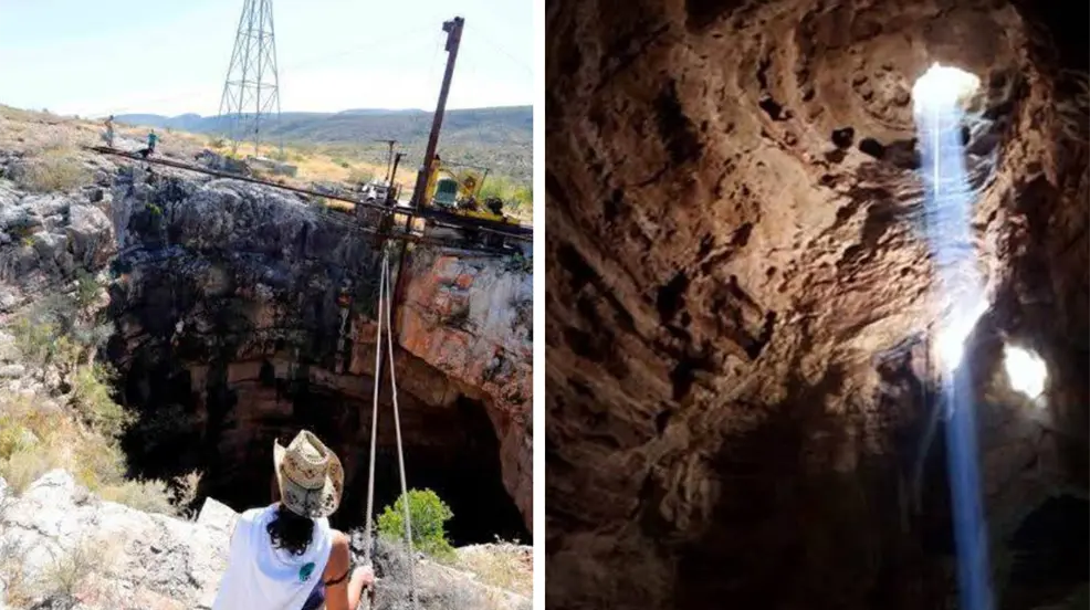 Exploradores que han intentado descender aseguran que dentro del cenote hay una bóveda del tamaño de un estadio, restos del Mar de Thetis, que hace millones de años cubrió lo que hoy son Texas, Coahuila y Chihuahua.