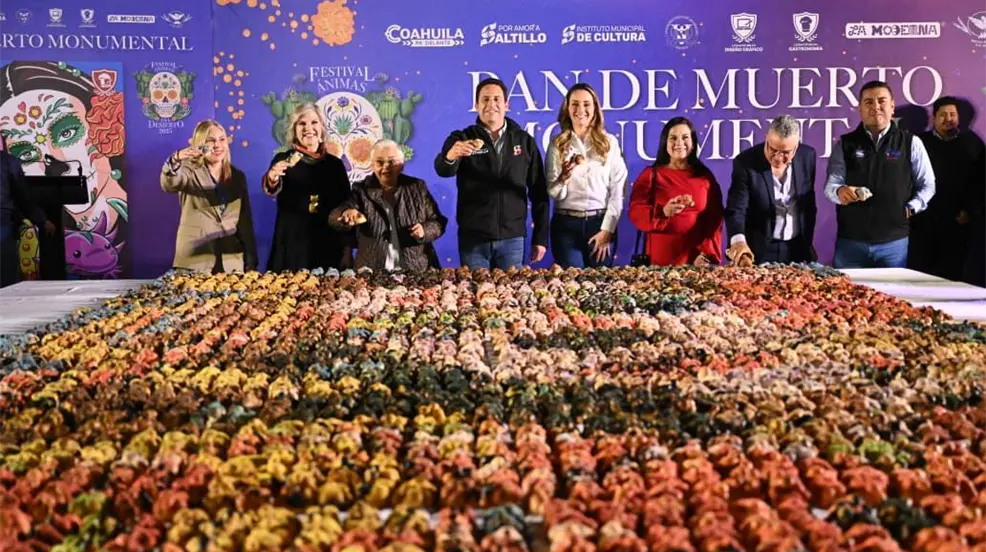 El alcalde Javier Díaz y familias saltillenses disfrutaron el Pan de Muerto Monumental durante el Festival Ánimas del Desierto 2025