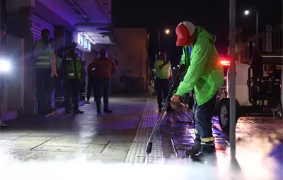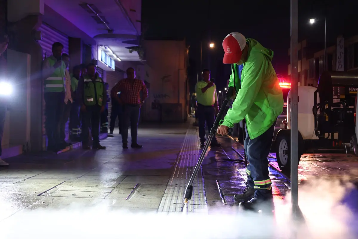 Para evitar molestias al tránsito peatonal y vehicular, las labores de limpieza se efectúan en horario nocturno, aprovechando el cierre de los comercios del Centro Histórico. Esto permite un trabajo más ágil y seguro, además de garantizar que las calles estén limpias y listas para su uso al día siguiente.