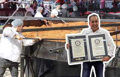 El monumental platillo alcanzó un peso de 5 toneladas y 102 kilos, cocinado en un disco de nueve metros de diámetro diseñado especialmente para la ocasión.