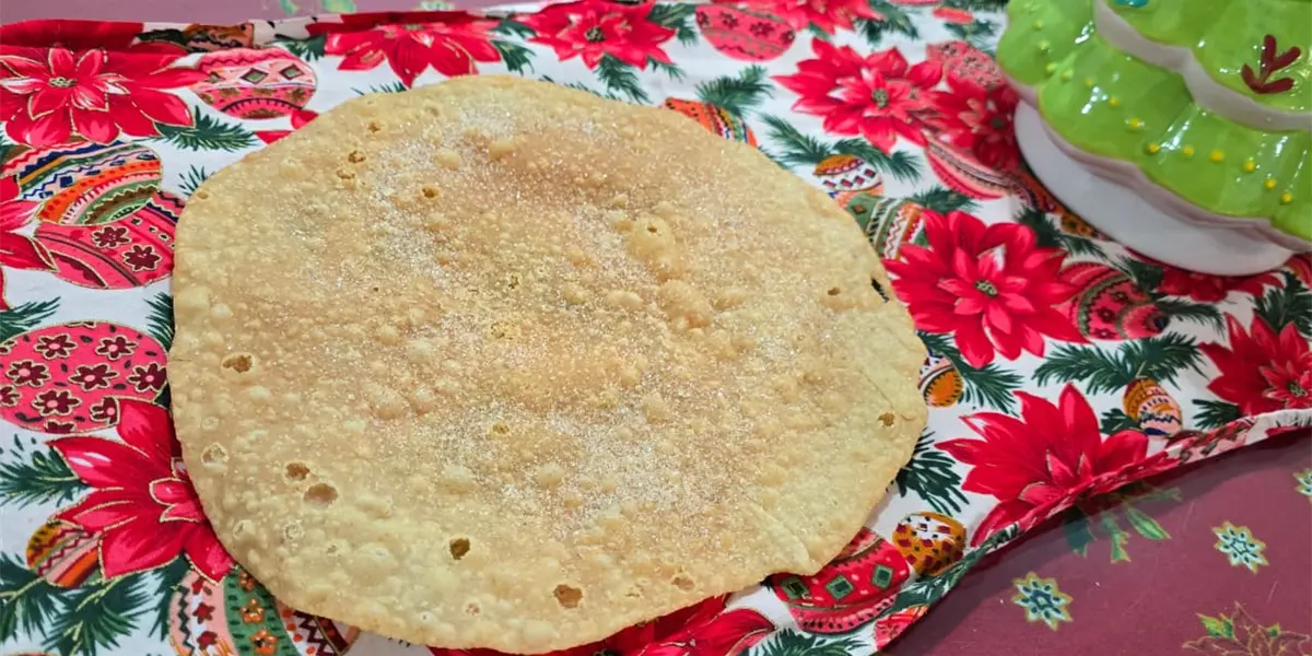 Lo crujiente de este platillo navideño radica en que es una hoja delgada de masa que pasa por aceite muy caliente hasta que esta se encuentre bien dorada, posteriormente se le añade azúcar con canela molidas y espolvoreada por encima.