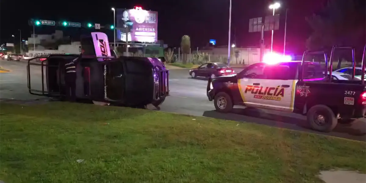 Una patrulla de la Policía Preventiva de Durango volcó cuando sus agentes estaban en camino a un reporte de detonaciones, en el que elementos de la Guardia Nacional habían solicitado apoyo al resto de las corporaciones.