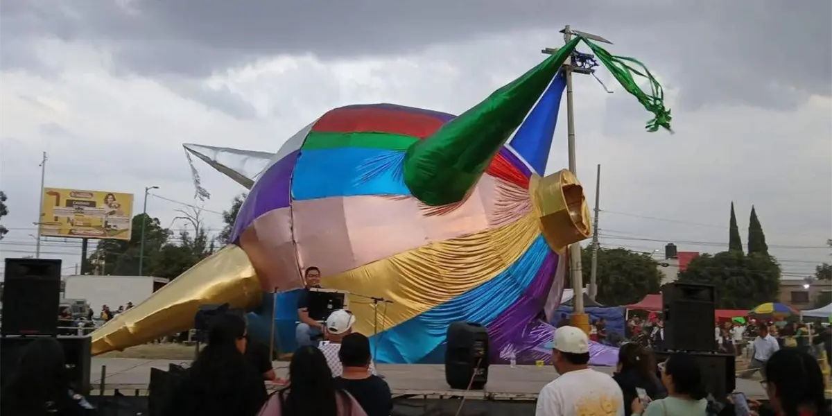 La piñata gigante de Cuautitlán, considerada la más grande de Latinoamérica con 45 metros de altura y 750 kilos de peso, colapsó por los fuertes vientos y ahora se encuentra en revisión.