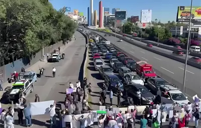 Manifestantes mantienen bloqueo en Periférico Norte exigiendo avances en la desaparición de Kimberly Moya en Naucalpan, Estado de México.