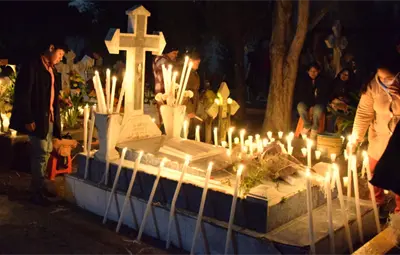 En ese lugar, las oraciones, los cantos y el brillo de las velas llenan el ambiente mientras se honra la memoria de quienes ya partieron, generando un momento de conexión, respeto y profunda tradición entre la comunidad.