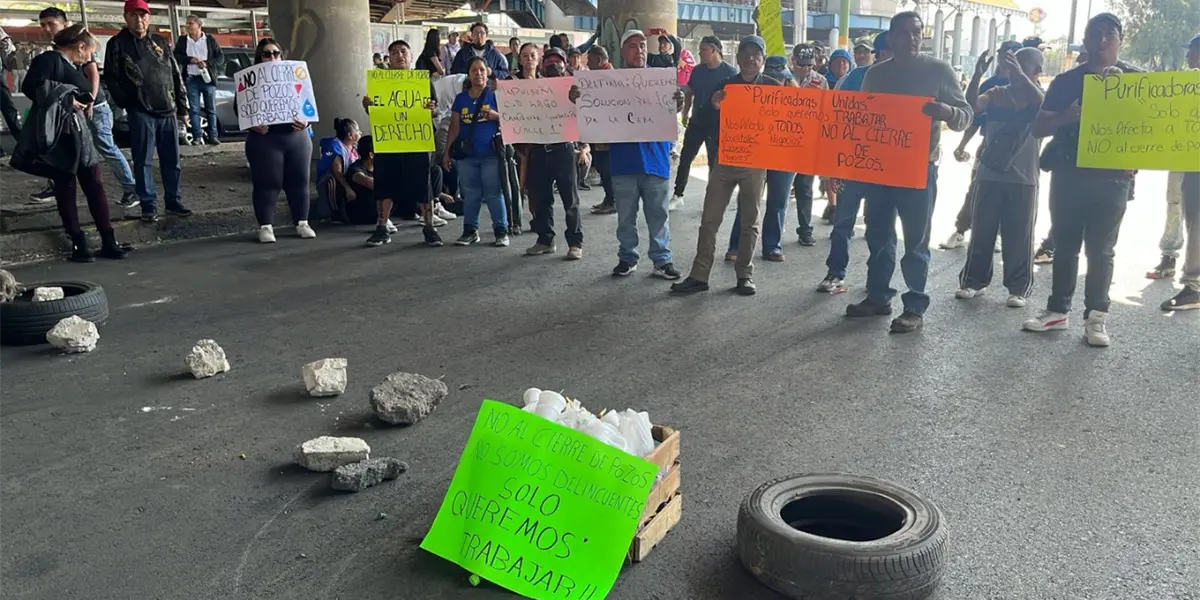 El bloqueo fue encabezado por comerciantes y purificadores de agua que exigieron diálogo con autoridades estatales para regular su actividad y evitar afectaciones por los recientes operativos contra el “huachicol” de agua.