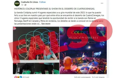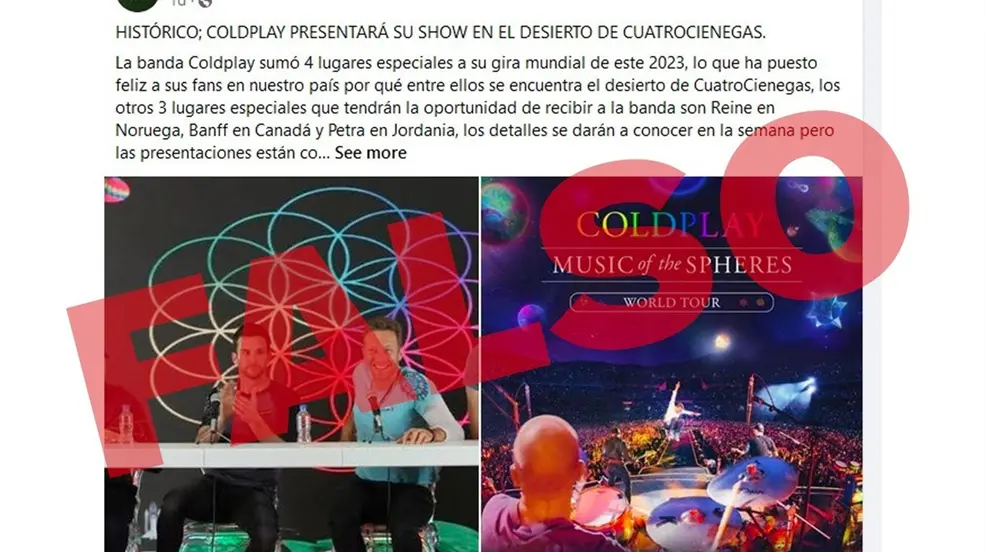 COAHUILA.- El fin de semana circuló una publicación en Facebook, donde se aseguraba que la banda Coldplay llegaría a tierras coahuilenses a dar un show, en específico al Pueblo Mágico de Cuatrociénegas.