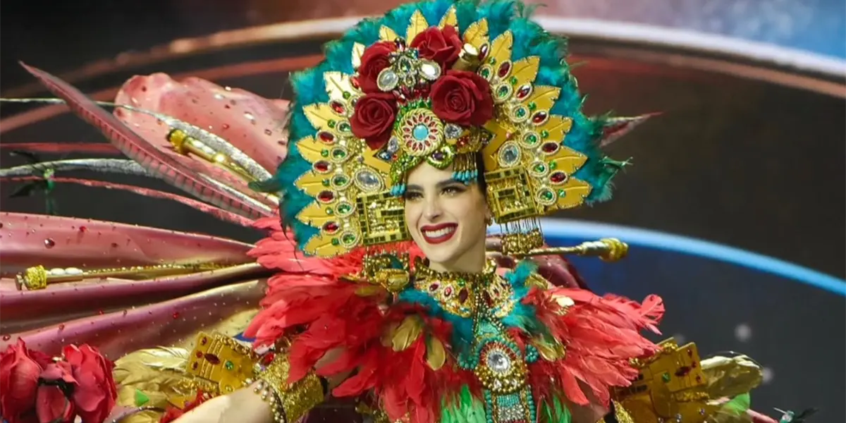 La noche inició con una explosión de simbolismo. Fátima Bosch apareció envuelta en la creación del diseñador Fernando Ortiz, un traje típico inspirado en Xochiquetzal, la diosa mexica de la belleza, el amor, el arte y las flores.