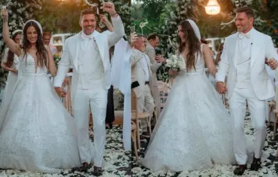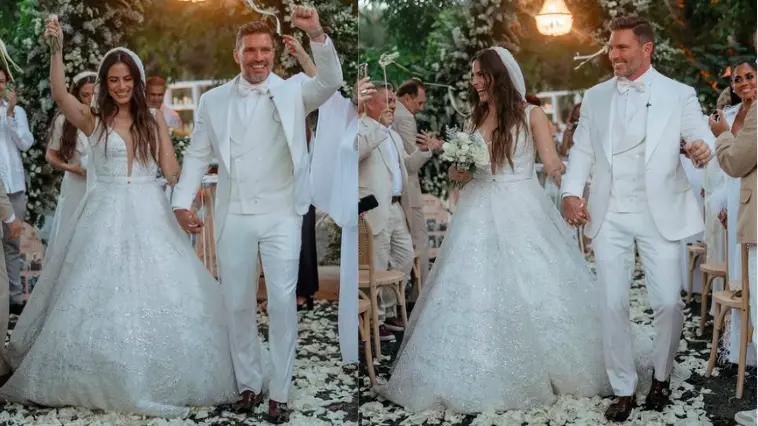 La novia, Valeria Marín, deslumbró con un vestido blanco creado por diseñador mexicano Benito Santos, mientras que Julián Gil optó por un elegante traje blanco de The House of Suits.