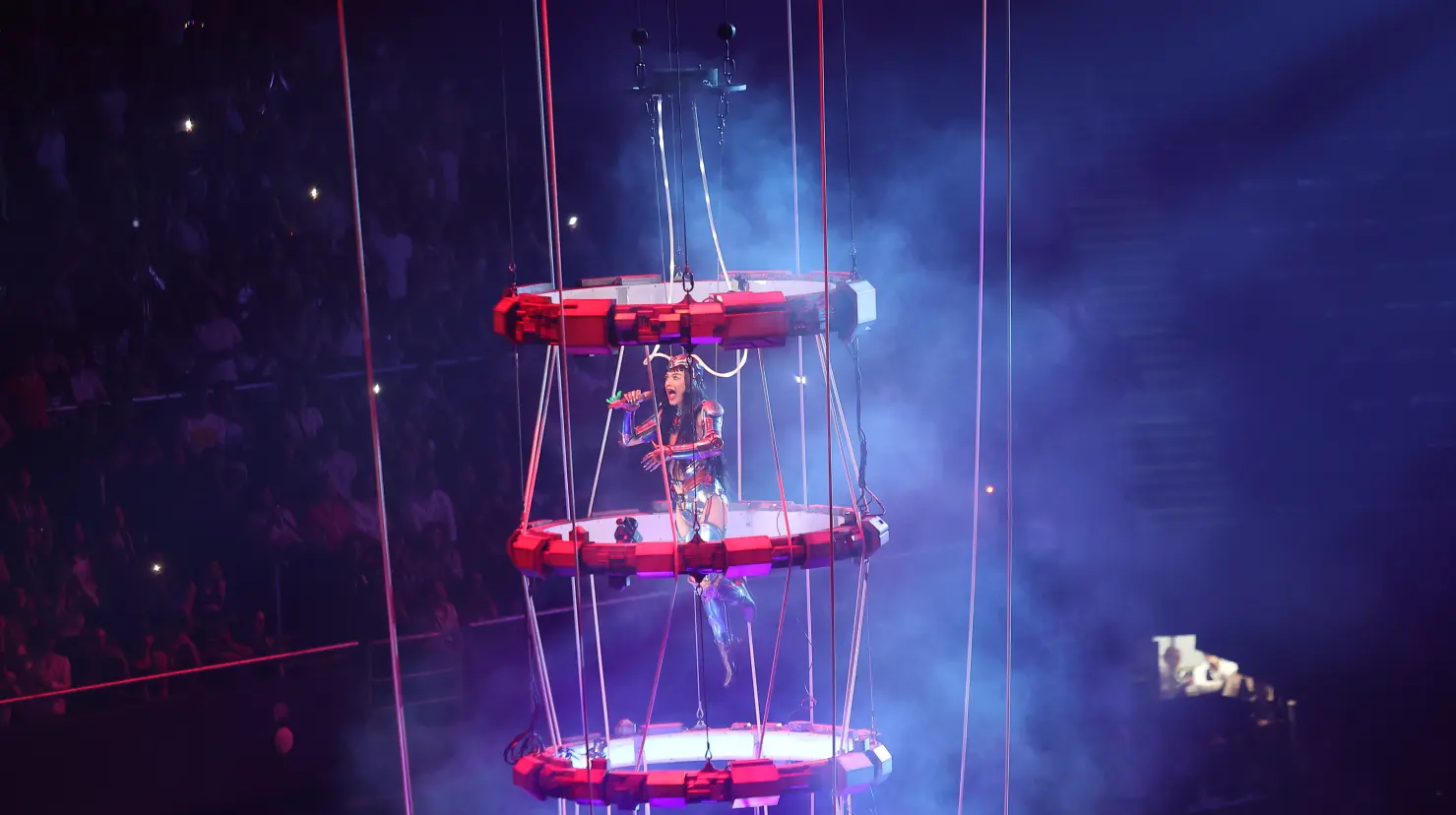 - Otro de los momentos favoritos del show fue cuando, con la ayuda de unos cables, la intérprete de Pitufina se elevó con mucha gracia y elegancia por los aires en el recinto mientras cantaba "Nirvana", lo cual le permitió que la audiencia la viera de cerca