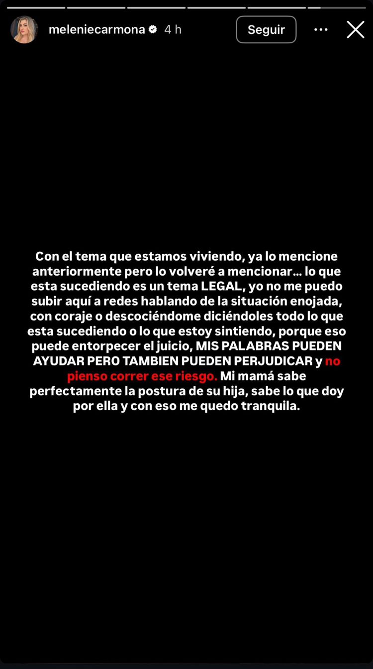Ante esta declaración, Carmona dijo: "lo que está sucediendo es un tema legal, yo no me puedo subir aquí a redes hablando de la situación enojada, con coraje o descociéndome diciéndole todo lo que está sucediendo o lo que estoy sintiendo, por eso puede entorpecer el juicio", aseguró.