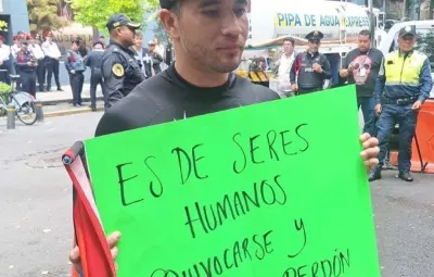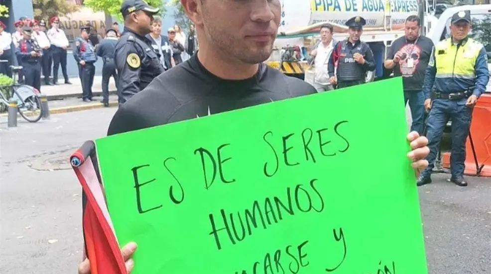 “Es de seres humanos equivocarse y pedir perdón”, así es como se puede leer en la pancarta color fosfo verde y una bandera gay que lleva entre sus manos, el también miembro activo de la Secretaria de Seguridad Ciudadana de la Ciudad de México (SSC-CDMX), quien también agrego que todavía sigue ser notificado de un despido una suspensión indefinida.