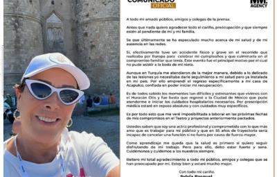 Es de todos sabido los momentos tan difíciles y estresantes que vivimos con el Huracán Otis y fue hasta que regresé a la Ciudad de México que pude atenderme e iniciar los cuidados hospitalarios necesarios. Por prescripción médica estaré en reposo absoluto y con cuidados muy específicos. Es por todo esto que me veré imposibilitada a laborar en las próximas fechas de mis compromisos en el Teatro y proyectos anteriormente pactados.