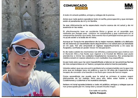 Últimamente se ha especulado mucho acerca de mi salud y de mi ausencia en las redes. Sí, efectivamente tuve un accidente físico y grave durante mi recorrido por Europa, confirmó Pasquel. La actriz, quien se ha vuelto viral en TikTok gracias al audio de mis ahorros, mi dinero, explicó que este percance fue el motivo por el cual no pudo asistir a la boda de su nieta Michelle Salas en Italia.