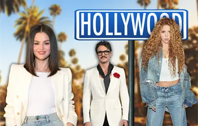 Selena Gomez, Pedro Pascal y Shakira posan frente a fondo de Hollywood (Foto: IG @selenagomez, @pascalispunk, @shakira / Canva)