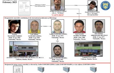 También se incluye en la lista negra a Ludim Zamudio Ibarra, hijo de Ludim Zamudio Lerma, y a los operadores de laboratorio Ernesto Machado Torres y José Santana Arredondo Beltrán, por ayudar al Cártel de Sinaloa al tráfico ilícito de fentanilo y otras drogas mortales hacia Estados Unidos.