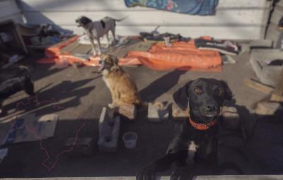 El refugio improvisado, del tamaño de un campo de fútbol, dio asilo a ciendos de pertitos de las zonas inundadas y cada hora llegan entre 20 y 30 animalitos, muchos de ellos heridos tras ser aropellados o casi ahogados. La comida para perros está esparcida por todas las instalaciones y los perros están encadenados a cierta distancia entre sí para evitar peleas.