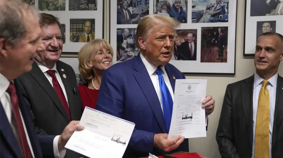 Horas antes de sus declaraciones, Trump se registró oficialmente para las elecciones primarias de 2024, convirtiéndose en la primera persona que ha realizado este proceso personalmente más de una vez después de haber sido presidente. En su cartel conmemorativo, escribió Vote por Trump y resuelva sus problemas.