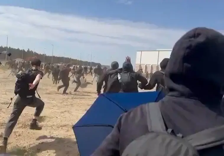 En redes sociales circularon varios videos que muestran a una multitud anti Tesla tratando de asaltar la fábrica.