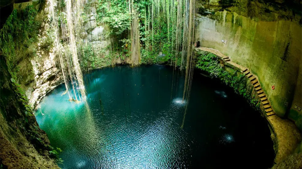 Cerca de Chichén Itzá está el Cenote Ik Kil, que es uno de los más emblemáticos y accesibles. Con más de 40 metros de profundidad, este cenote es conocido como el 'cenote sagrado azul' y está rodeado de vegetación exuberante y lianas colgantes. Ofrece instalaciones cómodas, incluyendo duchas y un restaurante, lo que lo hace perfecto para una visita después de explorar las ruinas mayas.