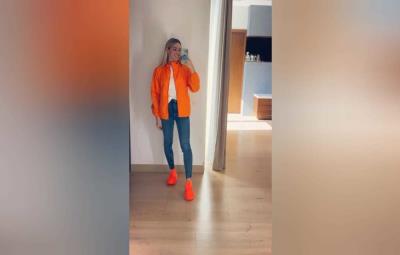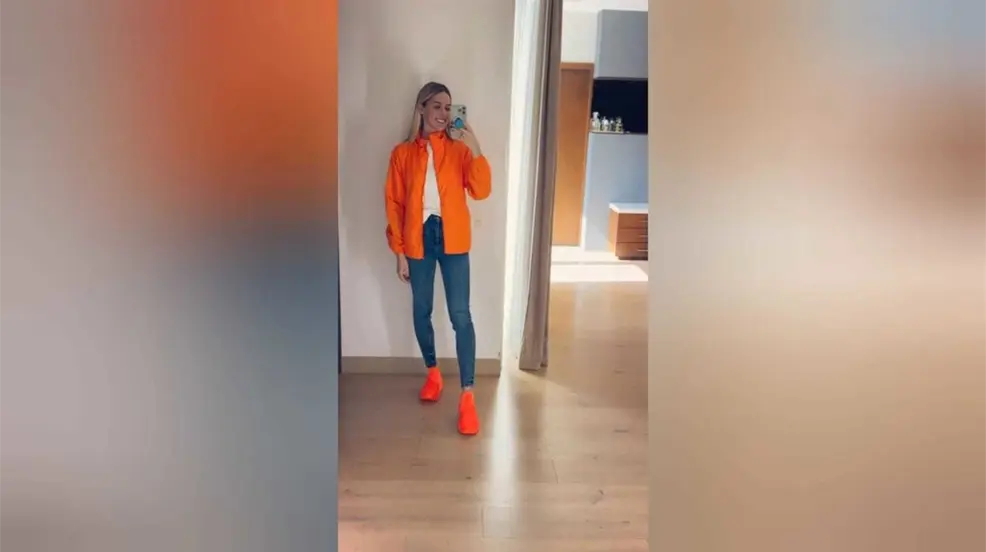 Al terminar de calzarse los tenis, Mariana Rodríguez con su celular en la mano y viendo la pantalla pregunta: '¿Quieren ver mis tenis? fosfo fosfo... va de nuevo.