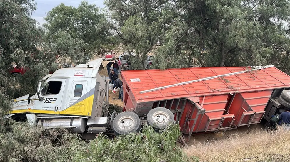 Accidente en la México-Pirámides: tráiler vuelca con 50 toneladas de cebada