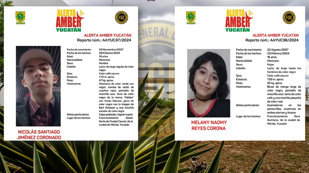MÉRIDA, Yucatán.- La Fiscalía General del Estado (FGE) ha activado la Alerta Amber Yucatán para la búsqueda de dos adolescentes desaparecidos en distintas zonas de Mérida.