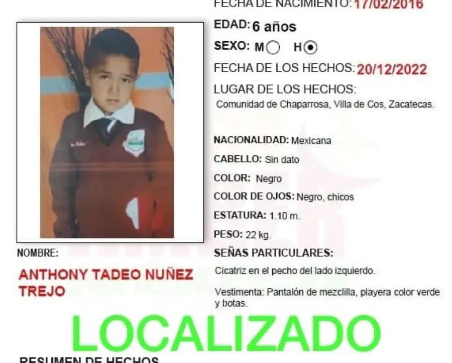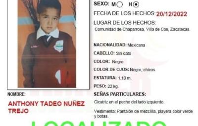 ZACATECAS.- La Fiscalía dio a conocer que el nño Anthony Tadeo Núñez Trejo, quien se encontraba desaparecido desde el pasado 20 de diciembre, fue encontrado con vida en el municipio de Morelos en Zacatecas.