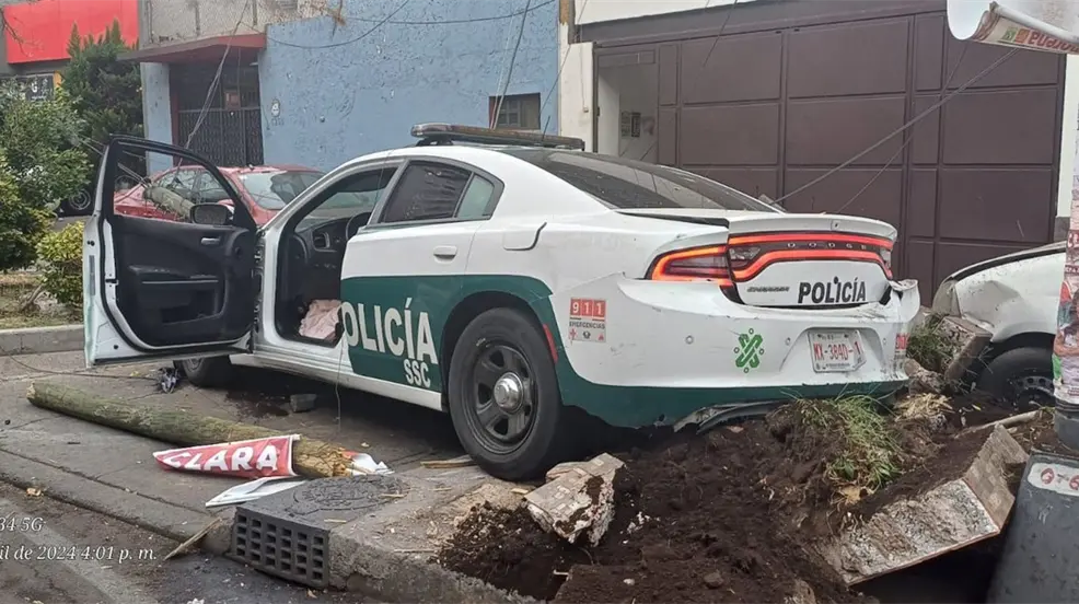 Producto del fuerte impacto, la patrulla de la SSC, golpeó una jardinera y un poste de madera, provocando su caída que terminó dañando dos vehículos que se encontraban estacionados muy cerca del lugar del percance.