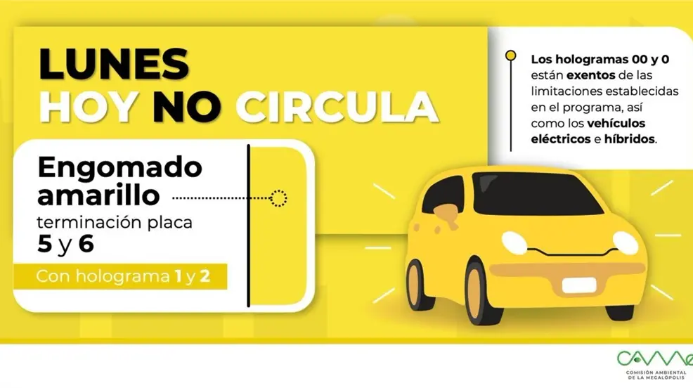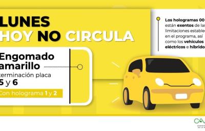 CIUDAD DE MÉXICO.- Este lunes 22 de julio, como parte del programa Hoy No Circula, se establece la restricción para la circulación de vehículos con engomado de color amarillo, holograma 1 o 2, y cuyas placas terminen en los números 5 o 6.