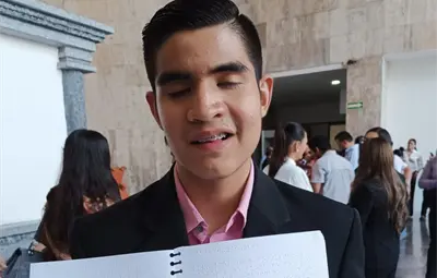 Con 8 horas de trabajo diario, porque un solo párrafo puede representar cinco hojas con perforaciones del idioma braille, el joven invidente César Andrés Cruz Palacios, de 19 años, requirió de casi un año para concluir la Constitución Federal.