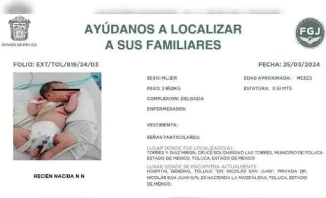 Gracias a la rápida acción de los paramédicos del Servicio de Urgencias del Estado de México (SUEM), la recién nacida recibió los primeros auxilios y fue trasladada al hospital Dr. Nicolás San Juan, donde se encuentra en perfectas condiciones. La menor, que mide 51 centímetros de largo y pesa 2.850 kilogramos, ha sido objeto de una alerta emitida por las autoridades para localizar a sus familiares.