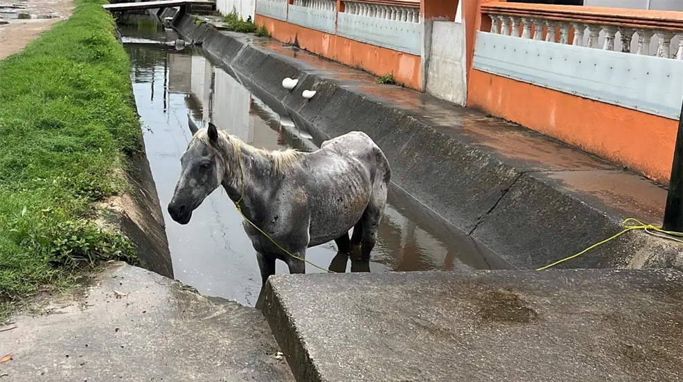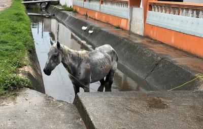 Ante la irresponsabilidad de un ser que dejo a su equino amarrado alado del conducto pluvial, el animal resbaló y quedó atrapado bajo el agua estancada de las lluvias registradas la mañana de este miércoles.