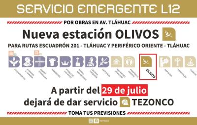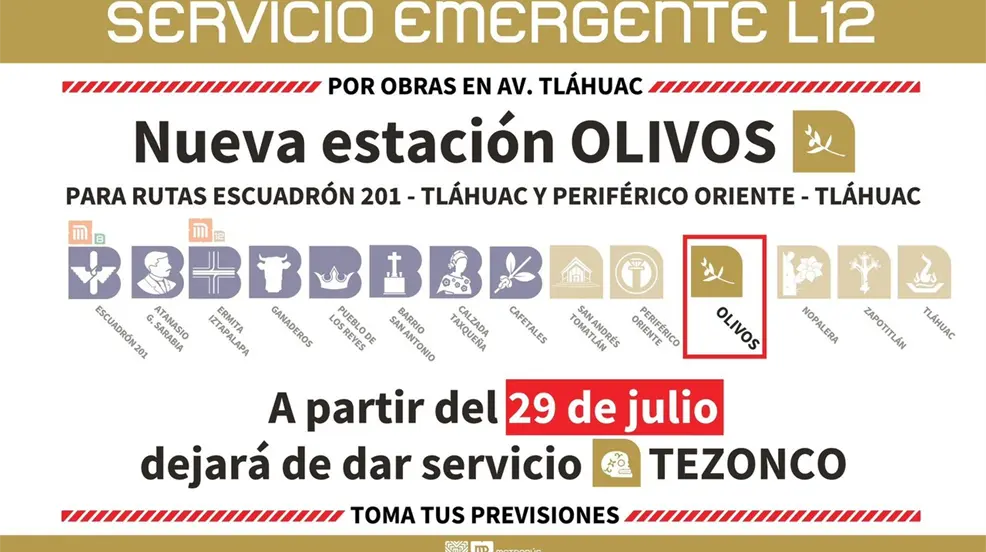 Ahora, las autoridades del Metrobús notificaron que a partir de este sábado 29 de julio la estación Tezonco dejará de prestar servicio en su ubicación actual, por lo tanto, a partir del lunes 31 de julio de 2023, el Metrobús pondrá a disposición de las personas usuarias una nueva estación frente a Metro Olivos. El acceso a dicha estación temporal se ubica en el camellón central de Avenida Tláhuac al cruce con Los Olivos, Alcaldía Tláhuac.