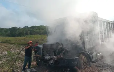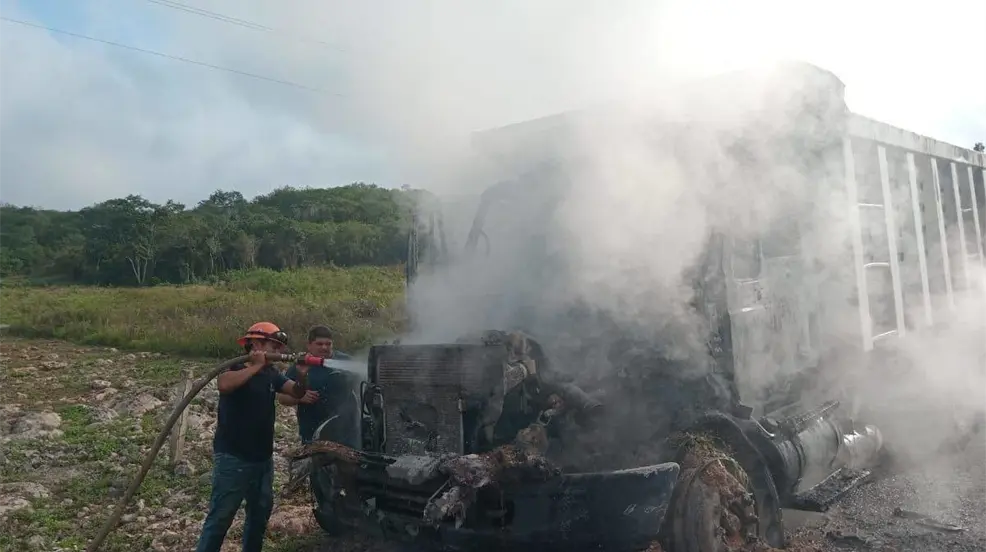 Camión de carga en llamas: Incendio por corto circuito en Oxkutzcab